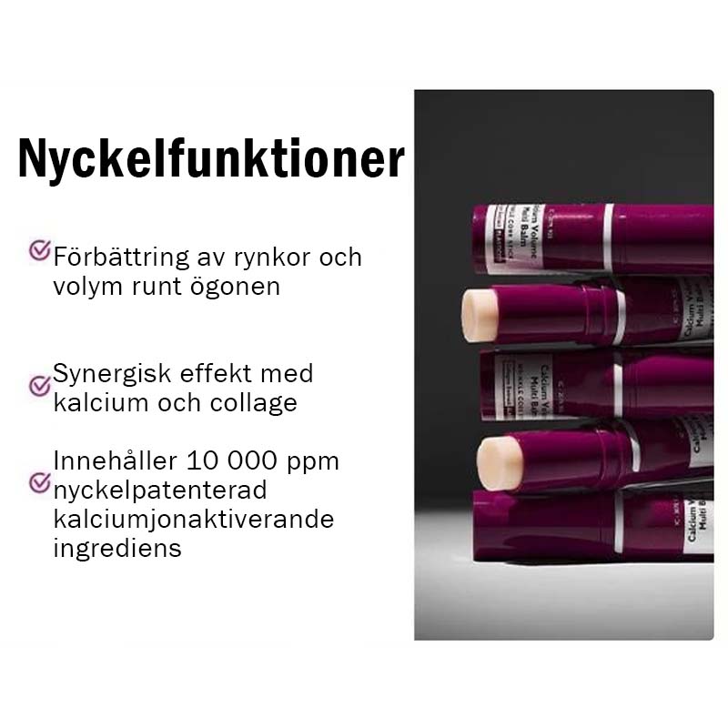 Calcium Multi-Vitamin Balm är den perfekta två-i-ett-lösningen för mörka ringar och slapp hud. Med D-vitamin och joniserat kalcium riktar sig detta balsam inte bara mot grundorsaken till mörka ringar, utan minskar även fina linjer och förbättrar hudens struktur, vilket gör att din hy ser fräsch och lyft ut.