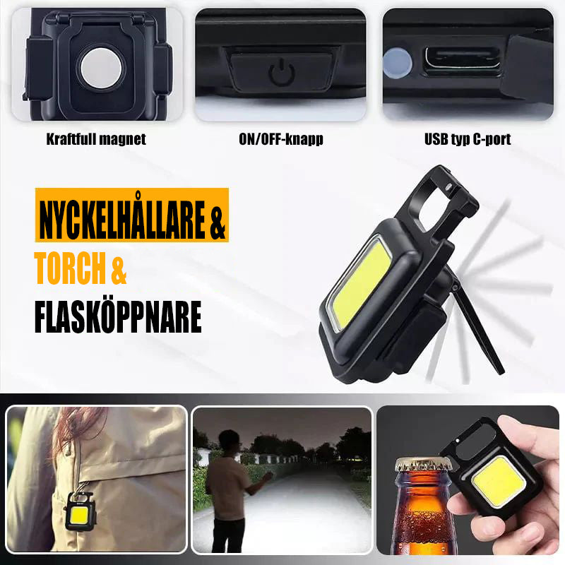 Denna mini-nyckelringsficklampa med COB-lamppärlor har en maximal effekt på 500 lumen, perfekt för vandring, bergsklättring, daglig användning, arbetsbelysning och nödljus.