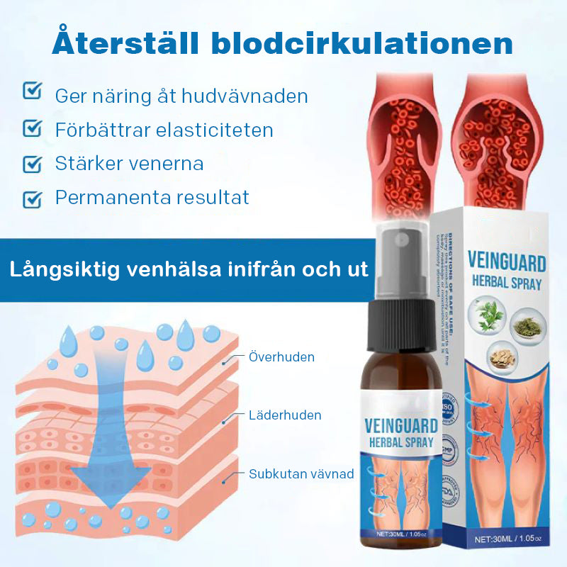 Sprayen innehåller naturliga antiinflammatoriska medel som hjälper till att minska svullnad, smärta och obehag i samband med åderbråck. Dessa ingredienser verkar för att lindra drabbade områden och ger snabb lindring av värkande ben inom 24–48 timmar.