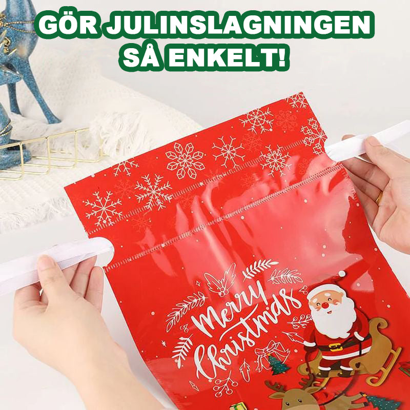 Presentinslagning: JulklappspÄsen har dragsko för enkel inslagning. Varje pÄse har en dragsko för enkel anvÀndning. LÀgg bara presenten i pÄsen, skjut etiketten pÄ bandet, dra i bandet och knyt en rosett. Inget behov av omslagspapper, sax, tejp eller band, vilket sparar tid och Àr mycket bekvÀmt. Detta gör att du kan slÄ in din present snabbt och vackert.